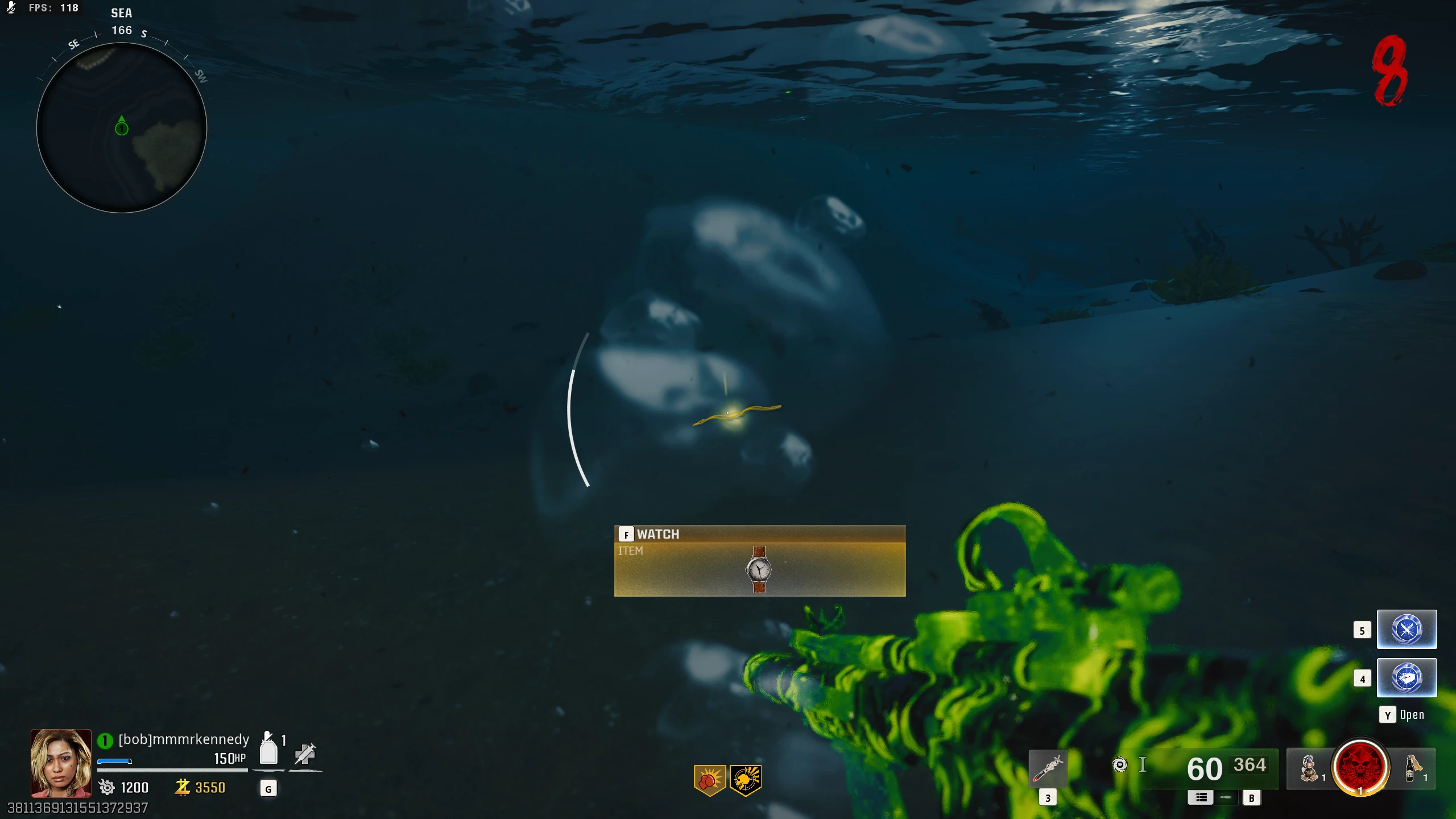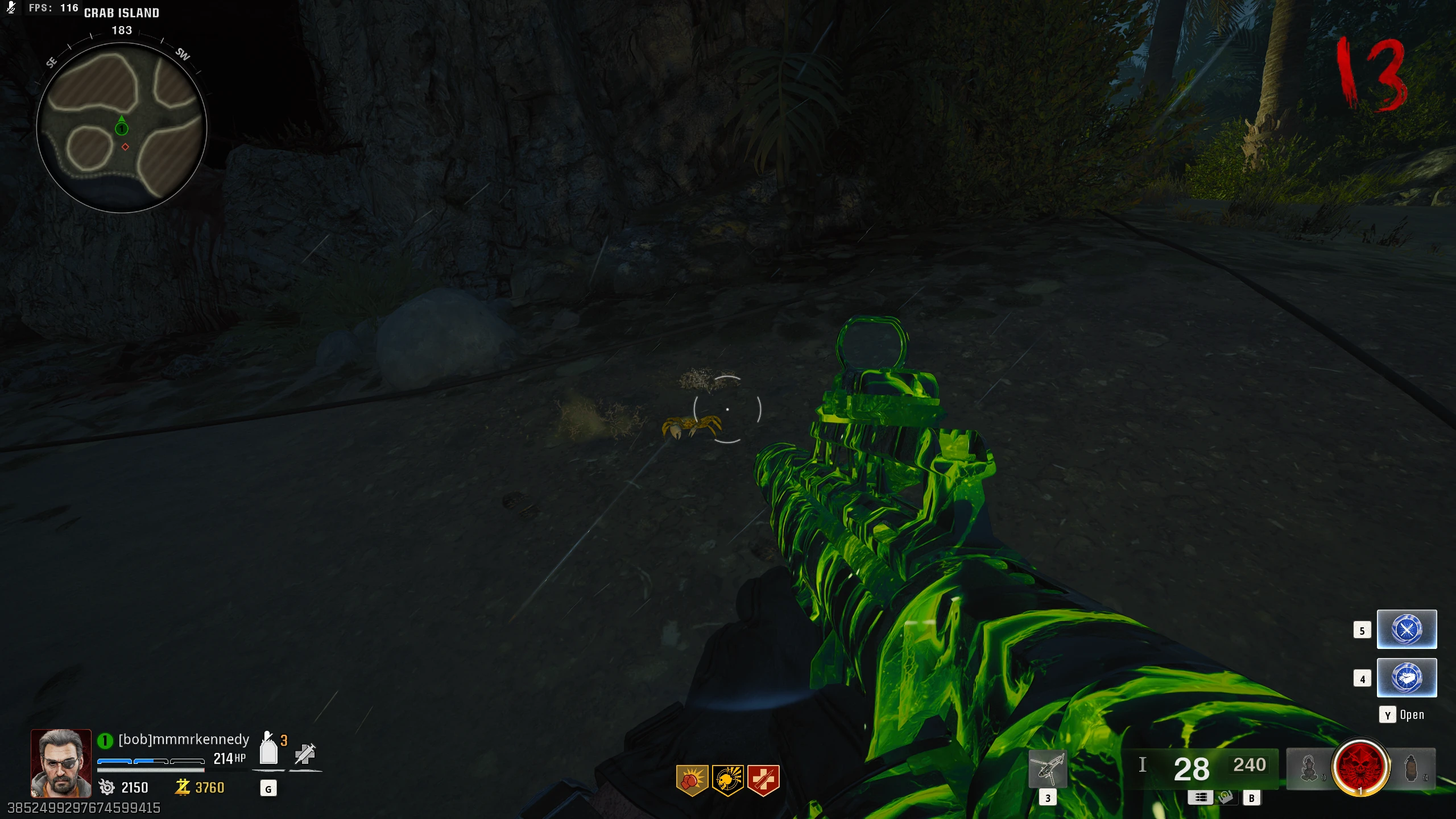 - Once you do enough damage, Patient 13 will leave the area for a short while. You must survive until Patient 13 returns. While you're waiting, zombies will spawn infinitely, and tentacles out in the water will shoot projectiles at you. You can shoot the glowing part of these tentacles to destroy them, though there is little point to doing this as they respawn frequently. Some of the projectiles leave behind an acidic puddle on the ground, which will damage you if you stand in it.