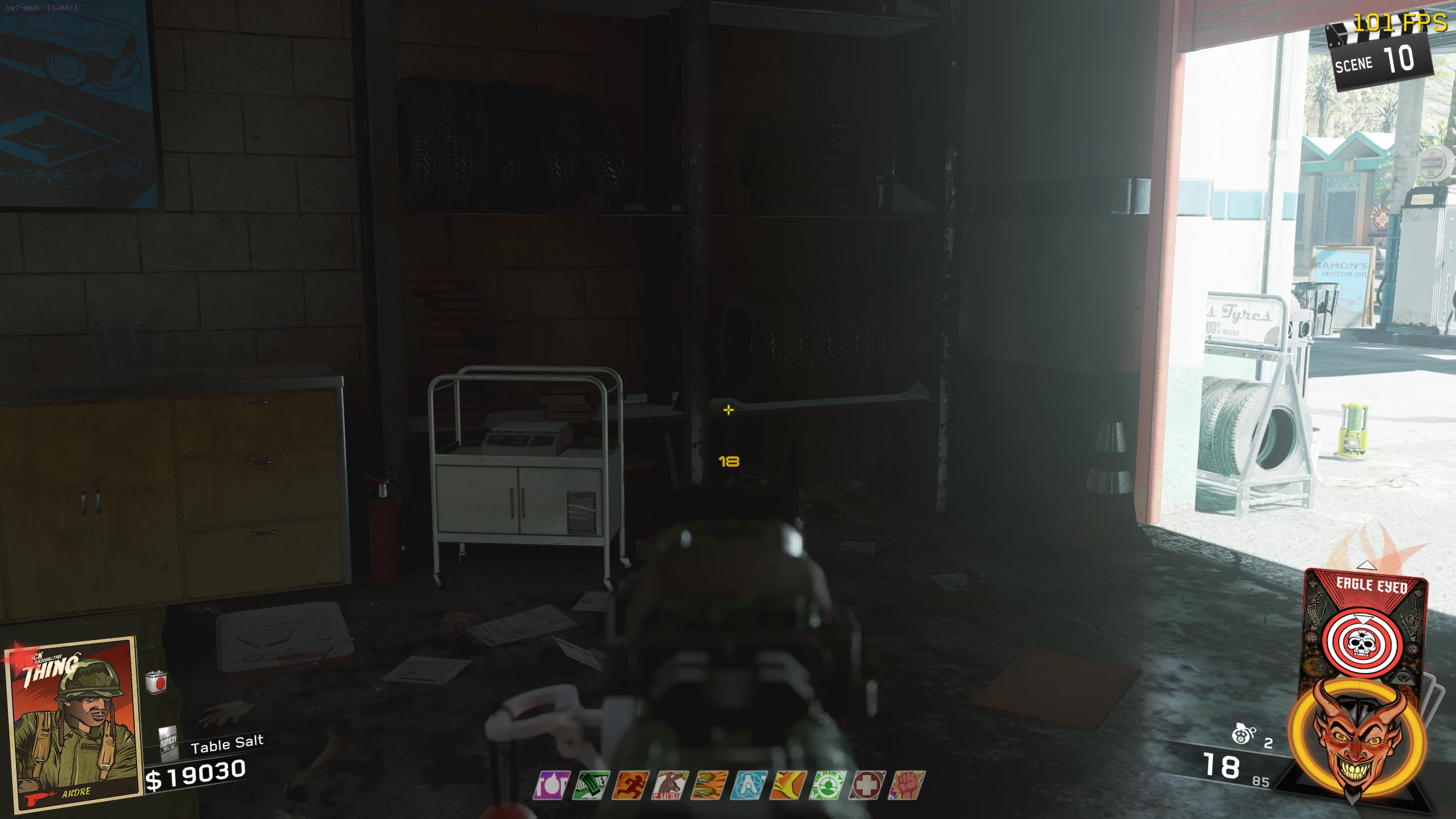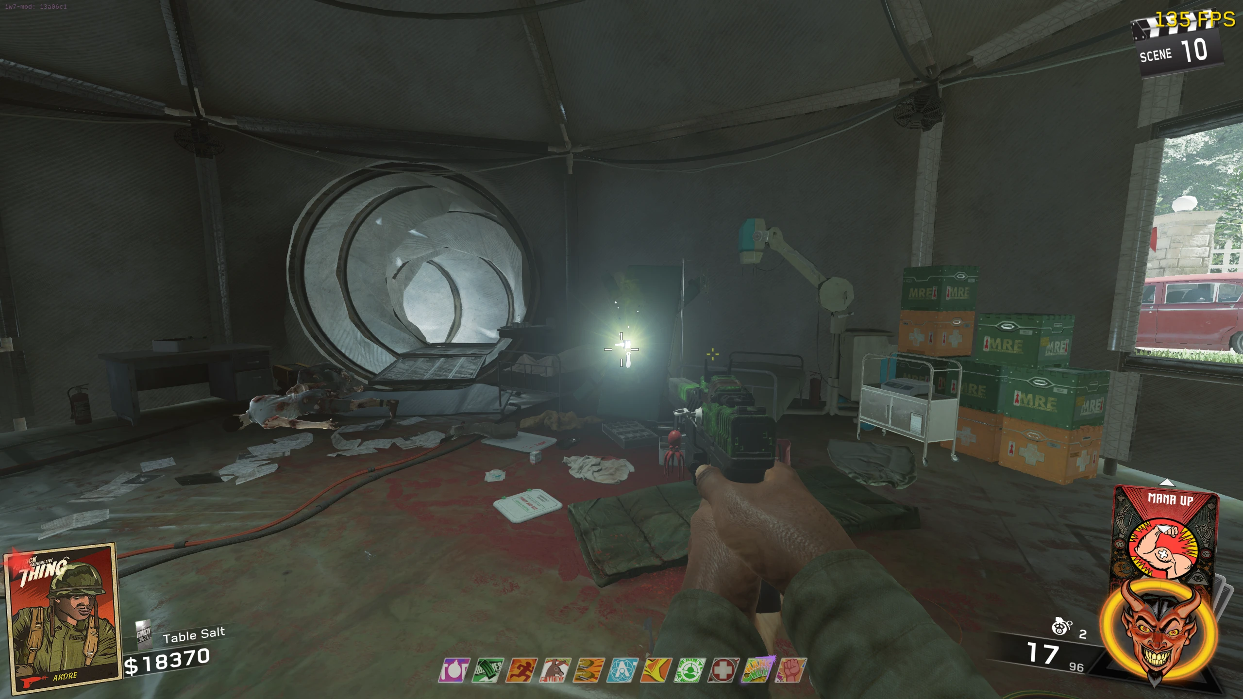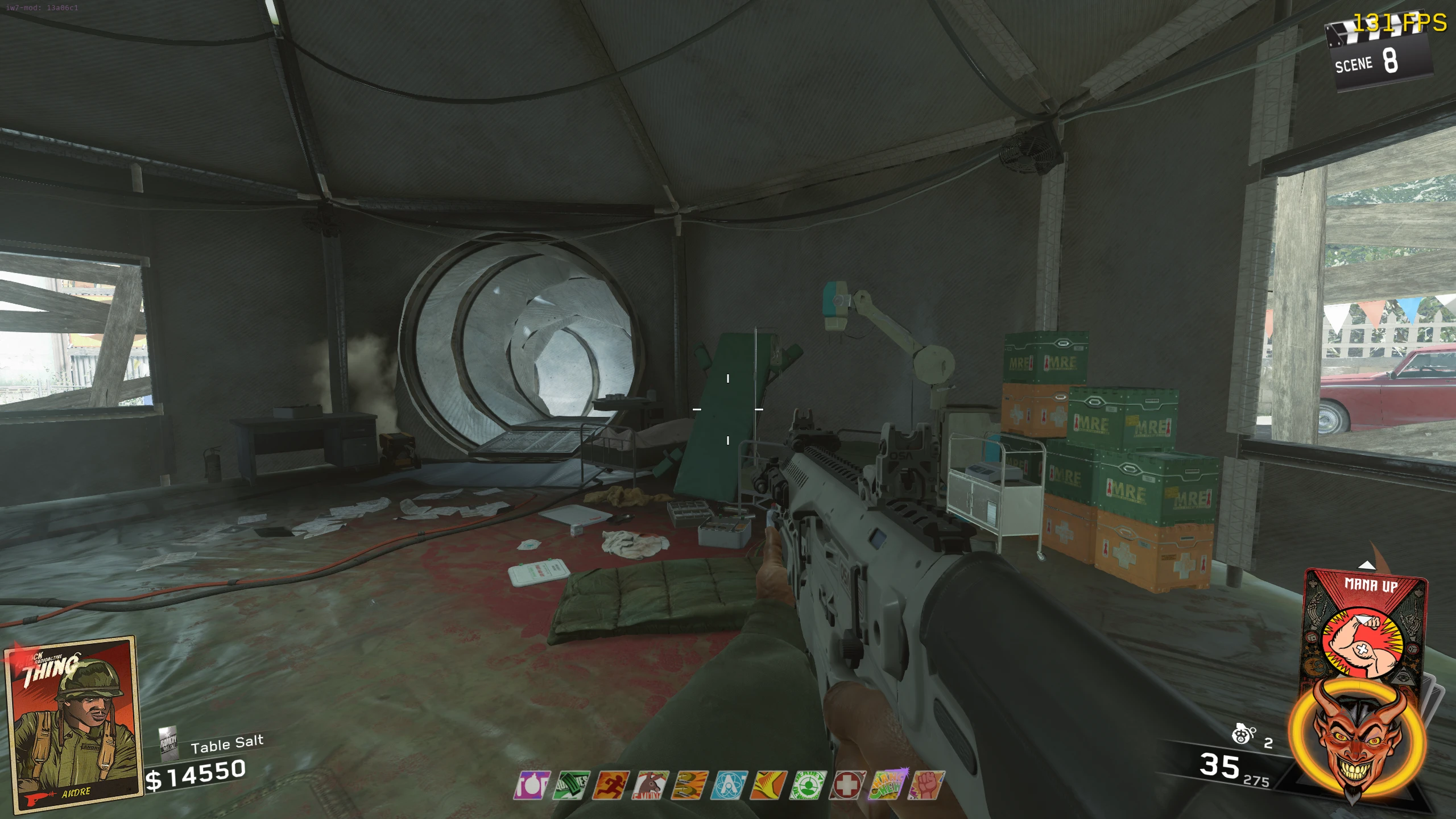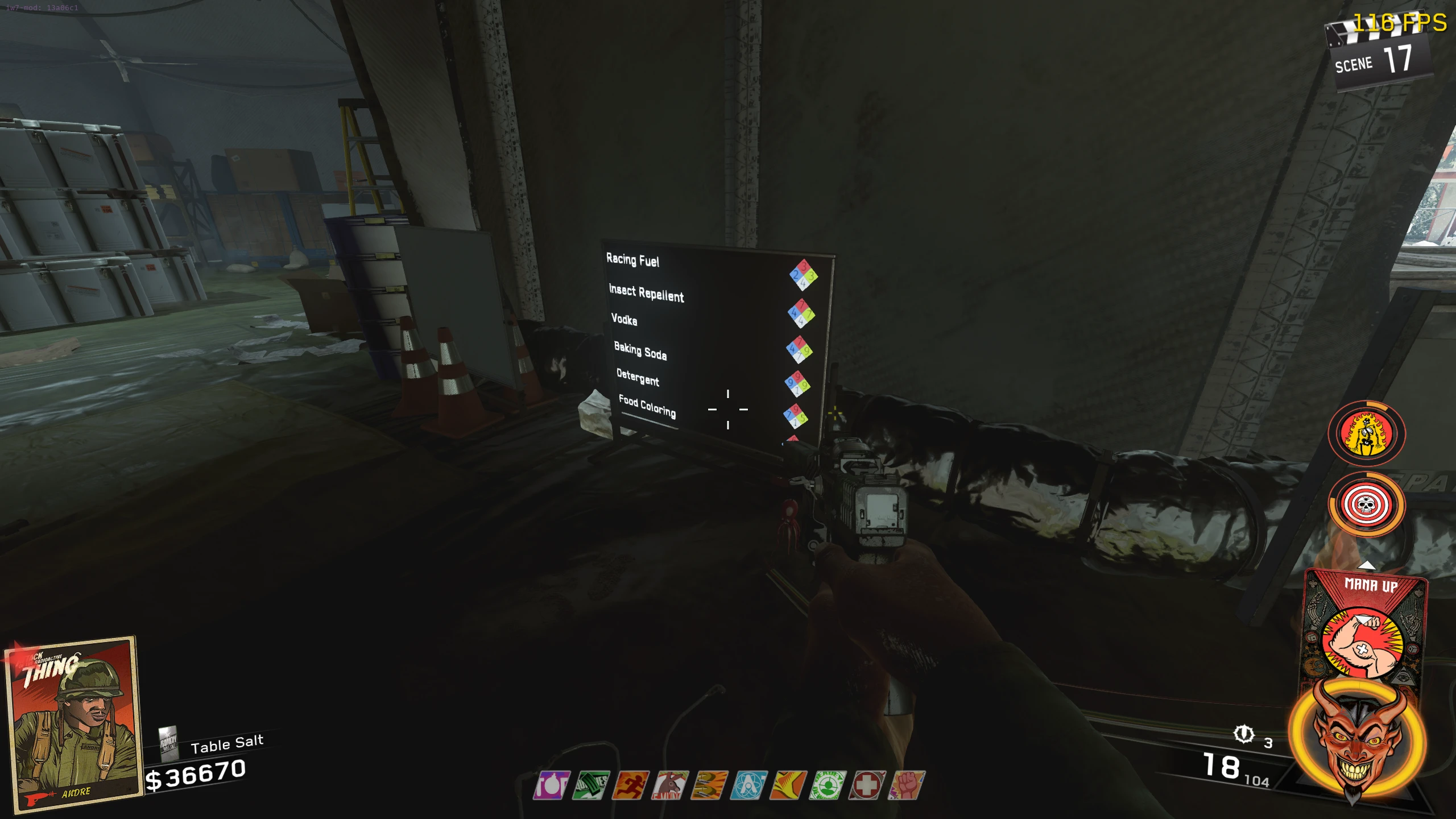 - Once you have all six body parts and the three pieces of glass, go to the spawn room (room with Up & Atoms) and place the body parts on the upright bed right of the tunnel out of the room. Then place the broken mirror on the table with the pill bottles left of the body. Place Elvira's Mirror on the crates, right of the Zombie spawn, right of the body. Place the Car Mirror on the large crate, across from/to the right of Up & Atoms.